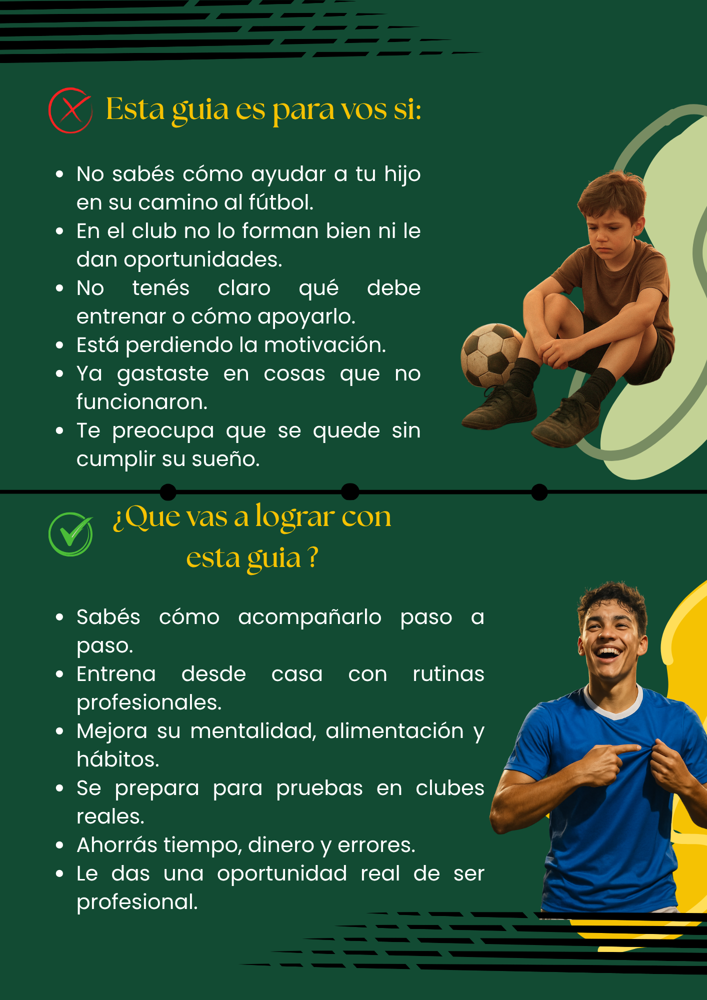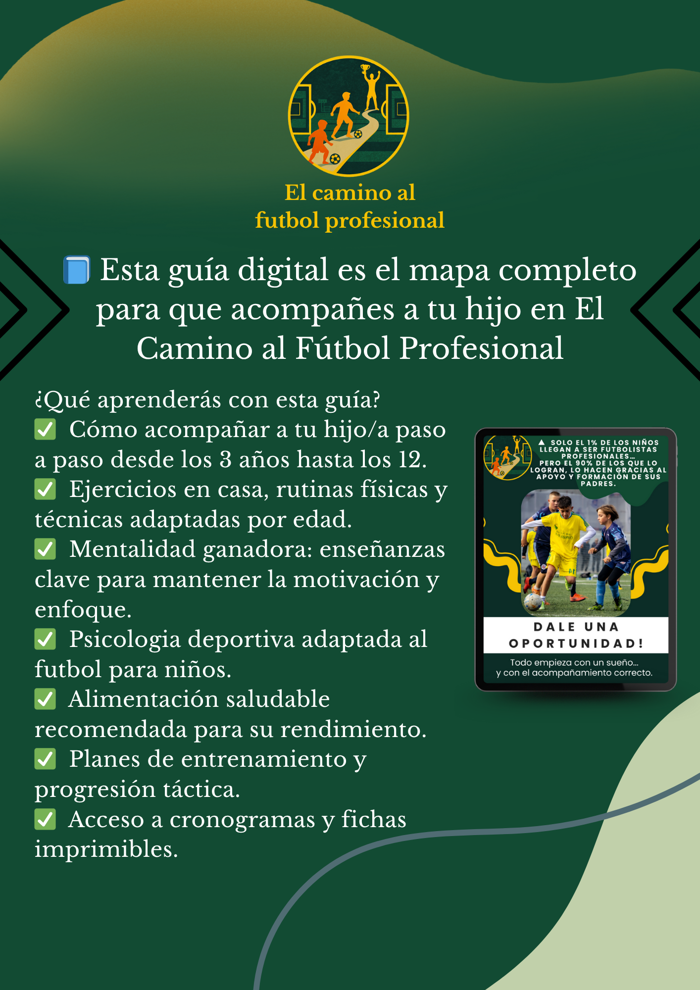 La guía está pensada para niños y niñas entre 3 y 12 años que aman el fútbol y sueñan con llegar lejos. Todo el contenido está adaptado según la etapa de crecimiento.